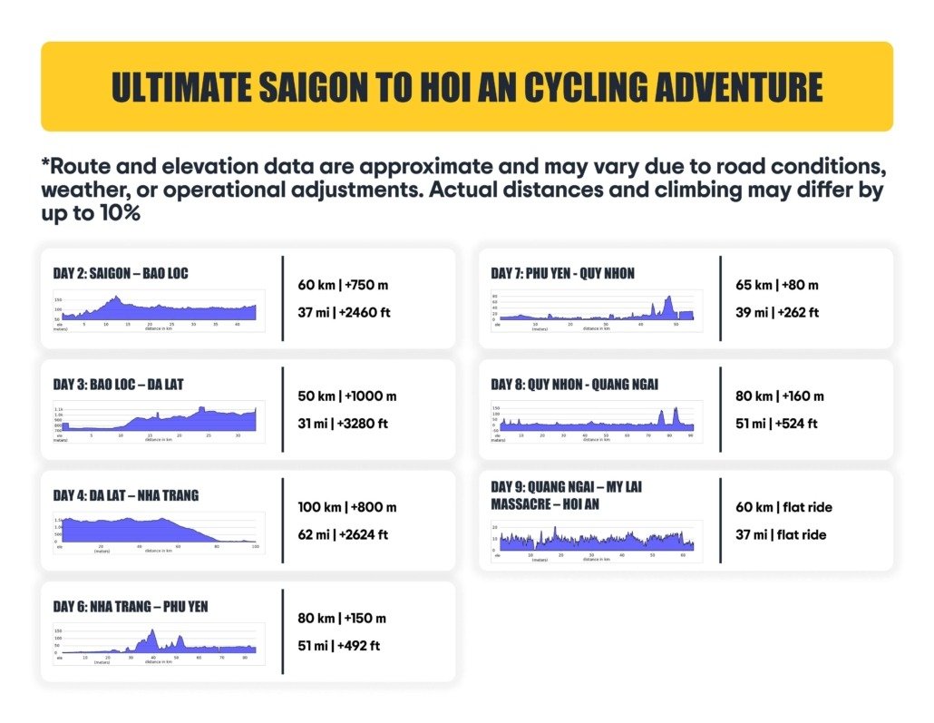 Embark on an unforgettable 10-day cycling adventure from Saigon to the historic town of Hoi An, traversing Vietnam’s stunning landscapes—from the highlands of Da Lat to the pristine coastline of Nha Trang and Quy Nhon.