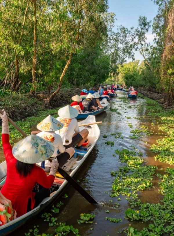 We’ll arrive at Tra Su in the early afternoon, when the majority of the tourists have departed. There, we’ll have the opportunity to walk along a floating bridge past vibrantly-coloured algae. There will be guided boat tours available through the shaded canals of the reserve.
