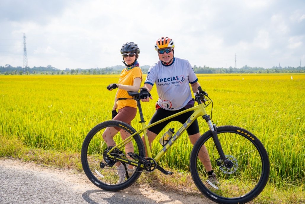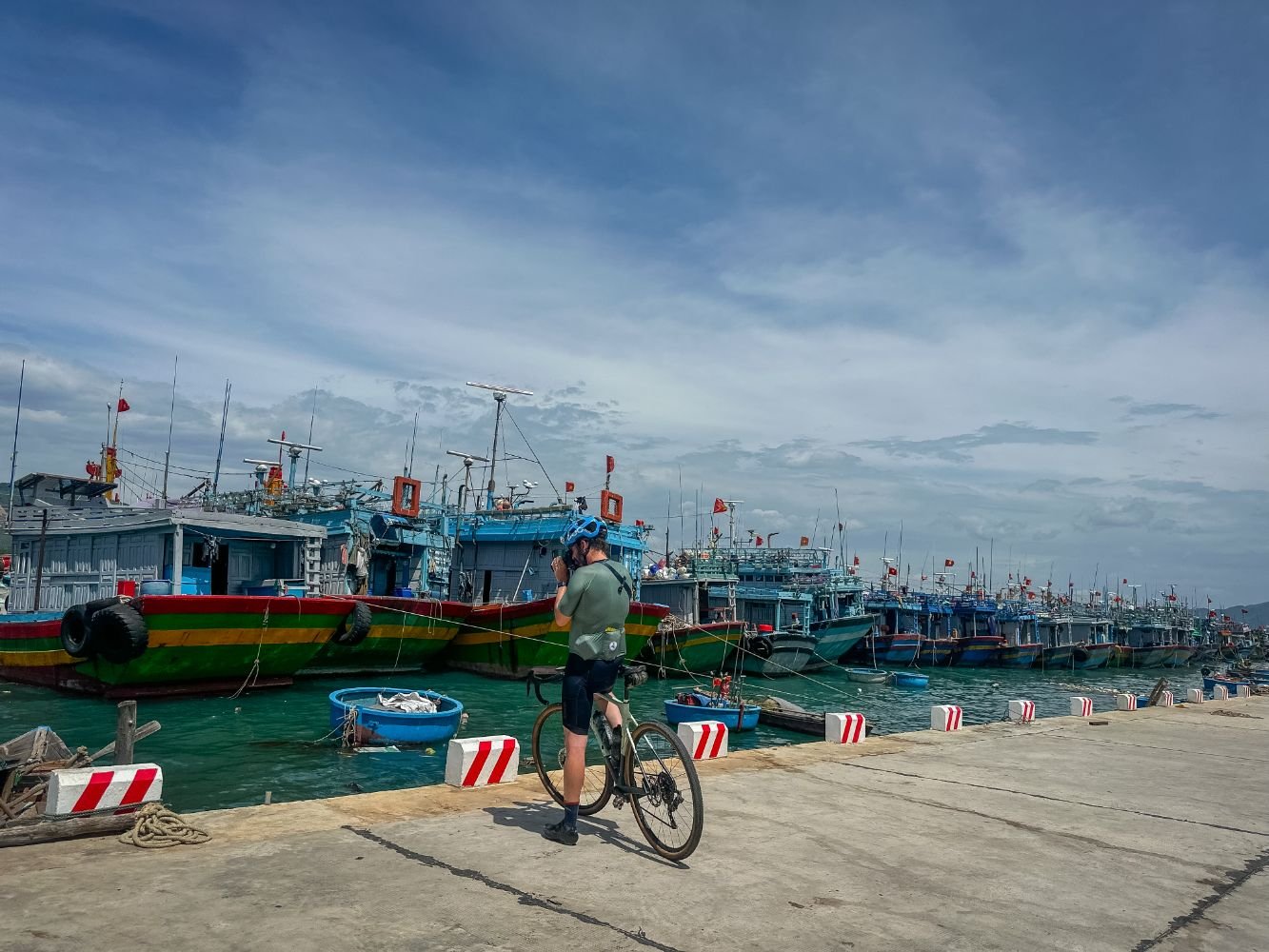We turn coastal today. Ride past shrimp farms, open rice fields, and quiet fishing villages on a mix of tarmac and rustic backroads.