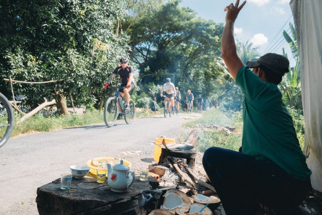 We turn coastal today. Ride past shrimp farms, open rice fields, and quiet fishing villages on a mix of tarmac and rustic backroads.