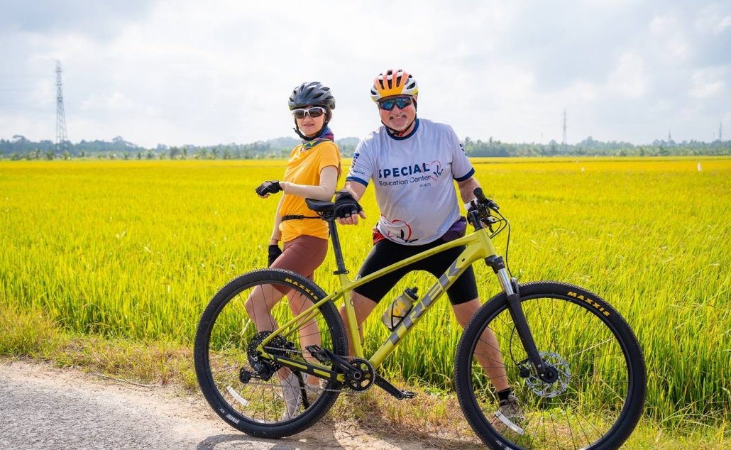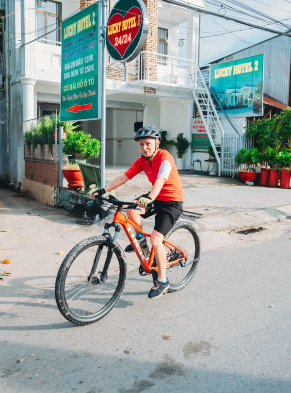 For the next two hours, cyclists will traverse the dirt paths through the rice paddies, many of which are elevated above the field for irrigation purposes. During the relatively flat ride, you’ll be immersed in the surrounding countryside culture, cruising past friendly farmers, colorful Mekong-style architecture, and the towering coconut trees that act as an agricultural staple for the area.