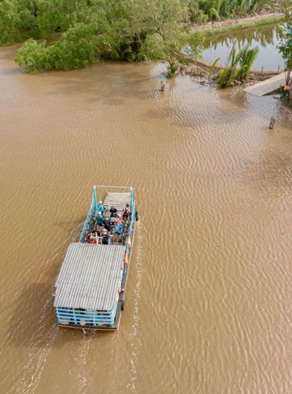 The first segment of the day’s journey features lightly trafficked, mostly paved country roads, protected from the sun by attentive lines of coconut trees. After 15 km, we’ll arrive at a ferry crossing the Mekong River.