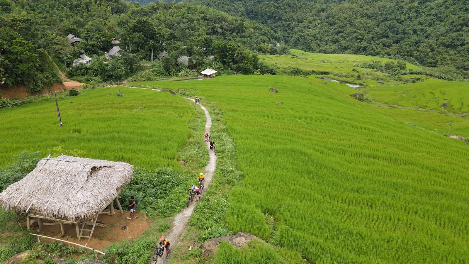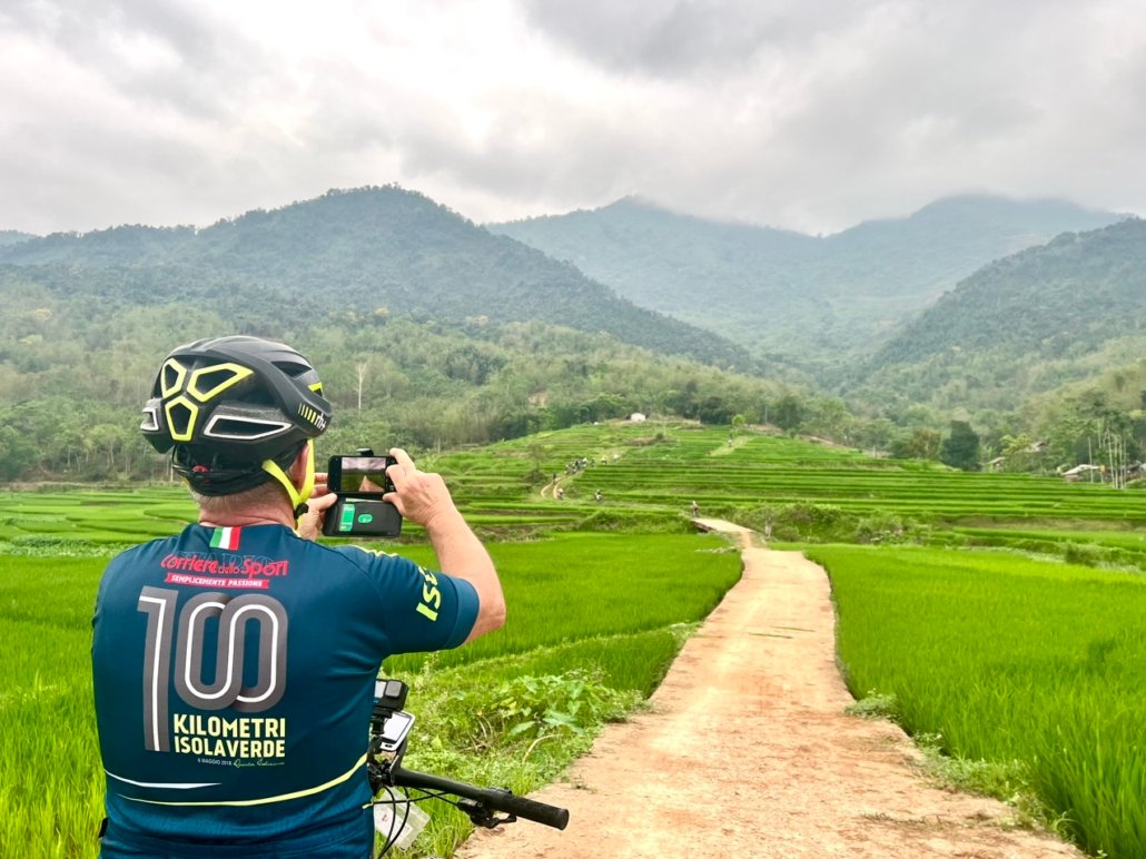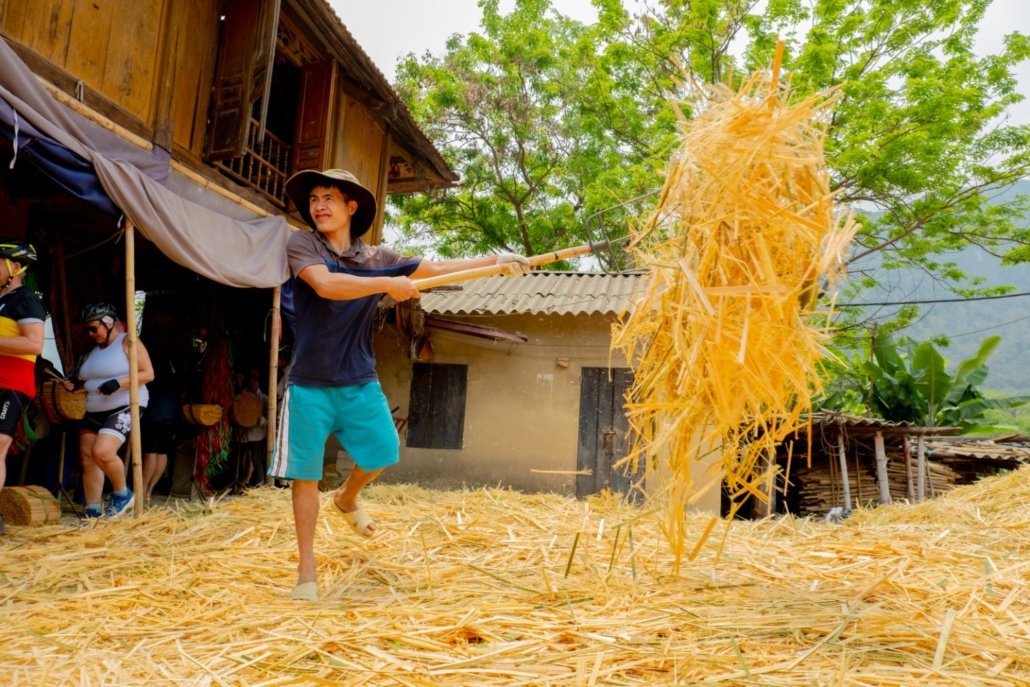 Today’s ride is more adventurous, with longer climbs and deeper immersion into rural northern Vietnam, yet it remains safe and accessible. The roads are lightly trafficked, and villages appear regularly along the route, offering a reassuring sense of connection despite the increasingly wild scenery. You’ll pass terraced rice fields, forested slopes, and small ethnic minority settlements as the terrain rises toward Pu Luong Nature Reserve.